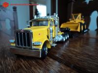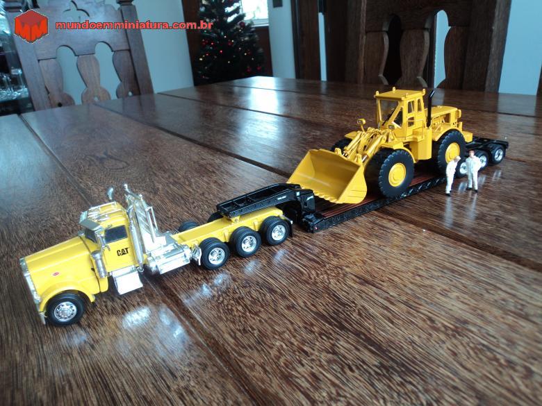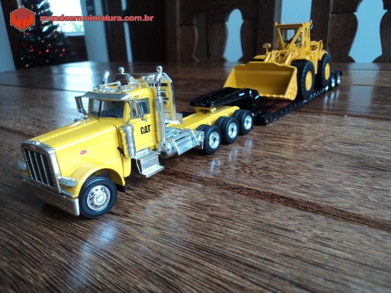 Descrição Cavalo mecânico Peterbilt, Modelo 389, fabricado pela Norscot, norte-americana. Produzido na China. Cavalo com três eixos tratores (8x6) e prancha lowboy de três eixos. Conduz uma pá carregadeira (front wheel loader) CAT 988, da CCM - Classic Construction Models, em escala 1:48. Essa pá carregadeira deu início às grandes pás da Caterpillar.