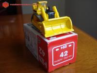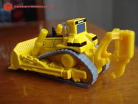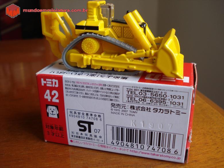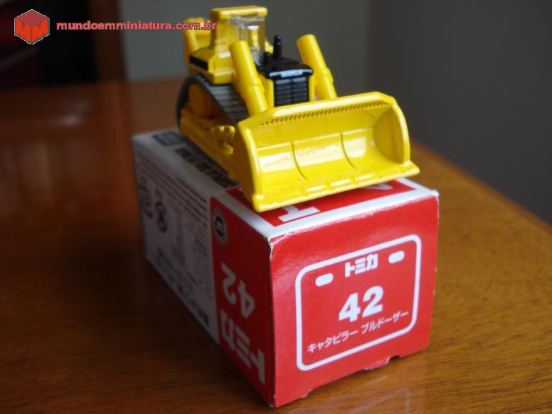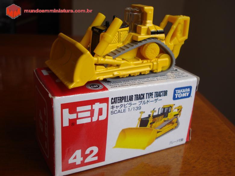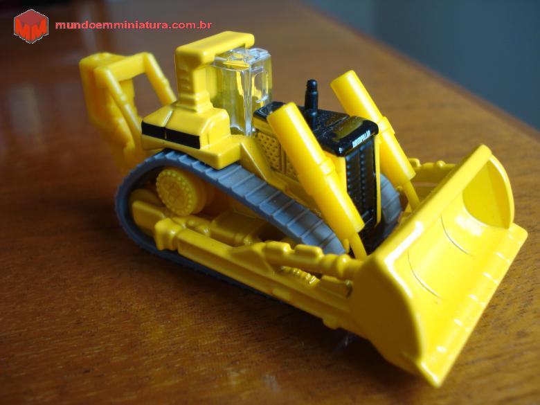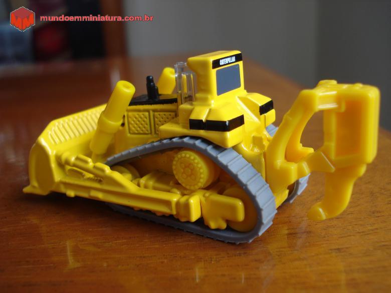 Descrição Trator de esteiras da Caterpillar. Observar que a escala é 1:139. Lâmina com articulação e esteiras cinzas, de borracha, móveis. Roda motriz elevada.
