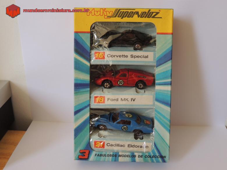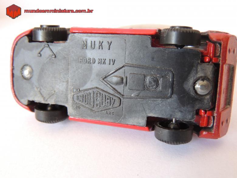 Descrição Miniatura Muky, produzida pela INDUGUAY, Made in Republica Argentina. Base em plástico. Capô traseiro se abre para mostrar detalhes do motor. Mniatura veio num pacote de três peças, que incluem, além do Ford MK IV, um Corvette e um Cadillac Eldorado, todos com base em plástico, embora as carcaças sejam em zamac.