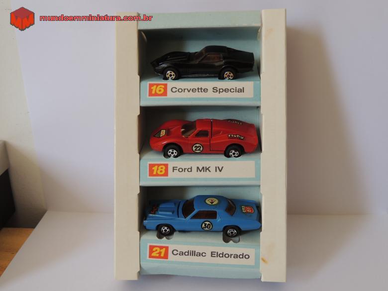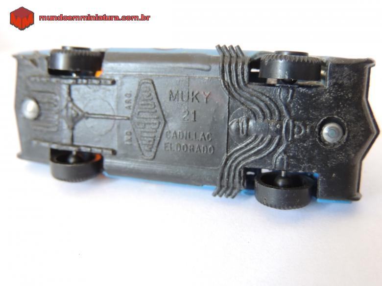 Descrição Miniatura Muky, produzida pela INDUGUAY, Made in Republica Argentina. Base em plástico. Capô se abre para mostrar detalhes do motor. Mniatura veio num pacote de três peças, que incluem, além do Cadillac Eldorado, um Corvette e um Ford MK IV , todos com base em plástico, embora as carcaças sejam em zamac.